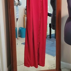 Form fitted Red Cocktail Dress with slit. Interesting neckline with sequin accent.