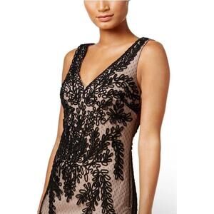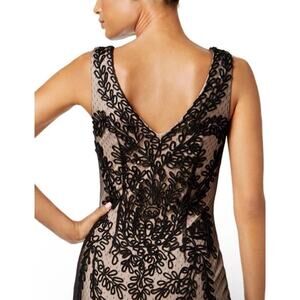 The Betsy & Adam Soutache Mermaid Black Over Nude Gown is a formal maxi dress designed for occasions such as weddings, parties, proms or cocktail events. This long gown features a floral pattern with accents of soutache detailing, a V-neckline, and a sleeveless design. Made of nylon spandex polyester, it is slimming and comes in a size 12. The dress has a zip and button closure, making it a designer piece that is perfect for any season.