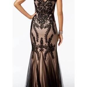 Betsy & Adam Soutache Mermaid Black Over Nude Gown Whimsygoth Formal Maxi Sz 12