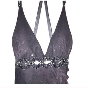 Betsy & Adam - Sparkly Ruched Gown from Macy's ~ Size 14. Sexy front with padding & plunged back. The color is really nice as it fades from black to gray/silver. *Never been worn*