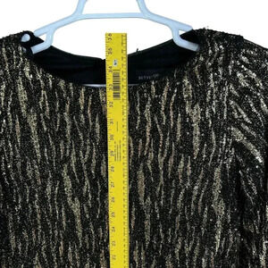 Indulge in a sparkling display with the Betsy Adam Women's Size 10 Metallic Sequined Mini Cocktail Party Dress. This long-sleeved mini dress is perfect for your next social event.