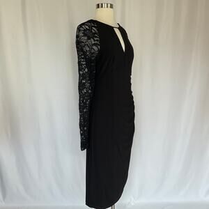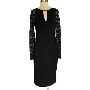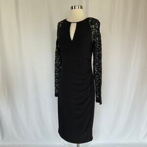 ~ Long sheer lace sleeves ~ Crew neckline with keyhole ~ Ruched at side ~ Slimming sheath silhouette ~ Straight, below the knee hemline ~ Concealed back zipper with hook and eye closure ~ Fully lined ~ Stretchable polyester/nylon/spandex