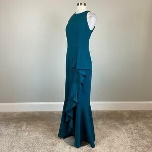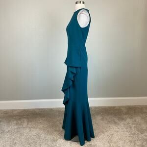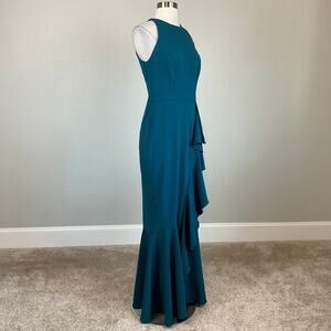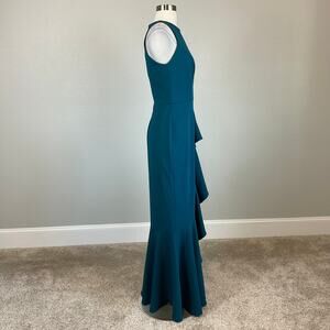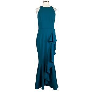 ~ Sleeveless ~ Halter neckline ~ Cut-in shoulders ~ Mermaid silhouette ~ Cascading ruffle ~ Long, floor-length hemline ~ Strapless-bra-friendly ~ Concealed back zipper with hook and eye closure ~ Fully lined ~ Stretchy polyester/spandex