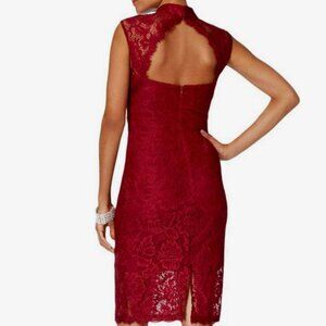 Gorgeous wine-colored dress. Lace covers a smooth sheath, rising to a collar while leaving the sheath behind in a sweetheart neckline for a modest-yet-daring look. There is a high window in the back to show off your shoulder blades. Cute, comfortable, and unique.