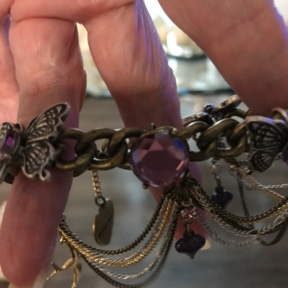 Betsy Johnson, collector Butterfly bracelet Gold tone chain link, silver tone butterfly’s with amethyst rhinestone body, large amethyst rhinestones, gold tone birds and draping gold, black $ silver chains