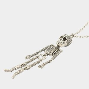Refined long chain necklace featuring playful skeleton pendant adorned with sparkly pavé perfect for a spooky statement. Necklace has an adjustable lobster clasp closure. Made from metal and glass crystal.