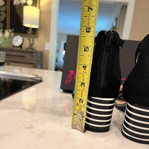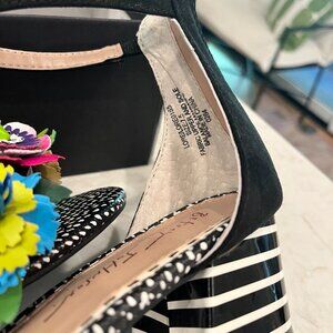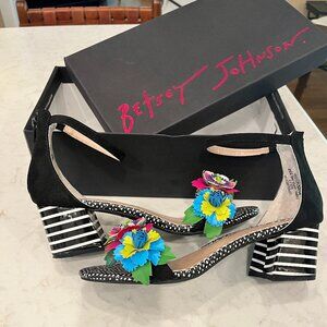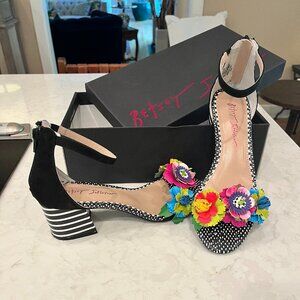 Great condition with floral embellishments and striped block heal. Incredible accent with colorful dresses.