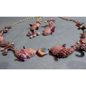 Betsy Johnson Koi Fish Necklace and Earrings Pink Sparkly Gold Tone Chain 21 in