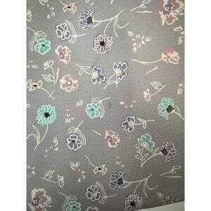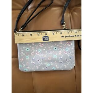 Betsy Johnson Lilac Floral Leather Mini Crossbody Bag. Small rectangle leather bag with small floral print all over. It has an adjustable strap with a zipper closure and gold tone logo on the front.