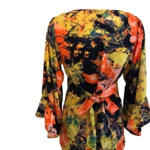 Betsy Johnson Multi Color Floral Blouse✨Deep V Neck✨Bell Sleeves✨Tie Back✨No Flaws✨100% Polyester✨Size Small