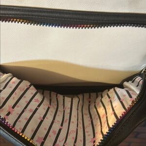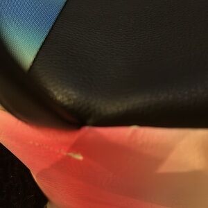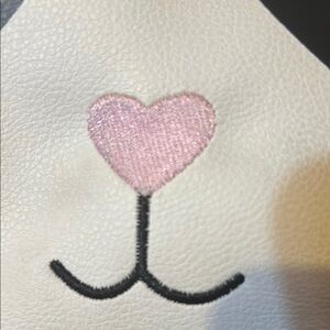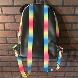 Adorable panda backpack with heart eyes design. Features a quilted black front pocket and rainbow straps. Perfect for those who love fun and colorful accessories. Only flaw is a small tears in faux leather at top of bag which does not produce an entire hole in bag.