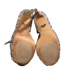 Betsy Johnson Platform Heels Floral Fabric Woman’s Size 7.5 Bandit-6 Inch. Featuring an Open Toe and Adjustable Ankle Strap, 2” Platform, 6” Stiletto Heel, Faux Leather Insole, Floral Fabric Upper. Straps have some peeling near buckle fasten, slight wear. Bottom and Upper good condition.