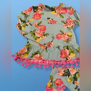 This Betsy Johnson two-piece swim set hits the perfect notes for playing in the sprinklers or splash pads. Long sleeves protect your kiddo from the sun. Bright pink pom-poms line the hem of the swim shirt and ruffles on the bottoms. Suit is fully lined. Body is 83% polyester, 17% spandex. Lining is 100% polyester.