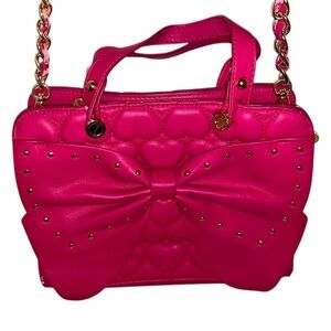 Betsy Johnson satchel style handbag purse featuring a beautiful gold bling detail on large decorative front bow, two handles with gold features, and the Betsy Johnson logo in gold metal on the backside. Outside shell is quilted with heart shapes. Inside in great condition with signature Betsy Johnson logos.