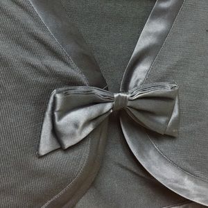 Adorable dusky-teal shrug to throw over a dress or skirt outfit, 70% silk 30% cotton. Bow buttons to close in front.