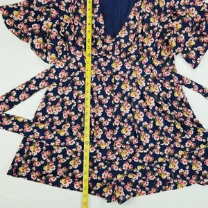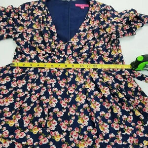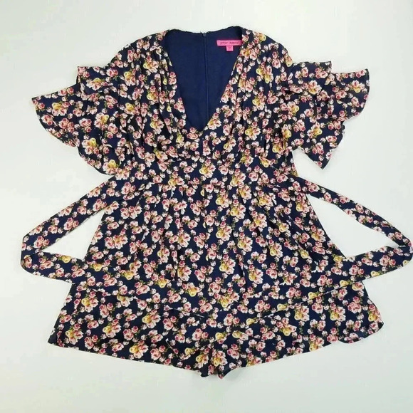 Betsy Johnson Size 6 Blue Pink Floral Ruffle Built in Belt/Tie Back Zip Romper