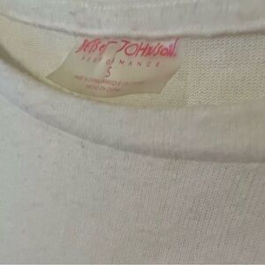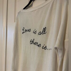 Quirky Betsy J sweater with sequin details and quote on back. Very slight piling under arms. Fits like S/M