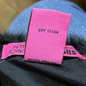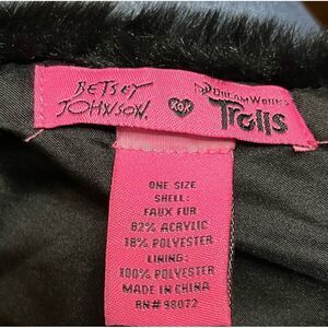Betsy Johnson’s whimsical Troll Collection, faux fur on one side, polyester lining on the other. Black with magenta flowers designed like the 60s era when Troll Dolls were popular.