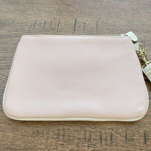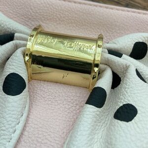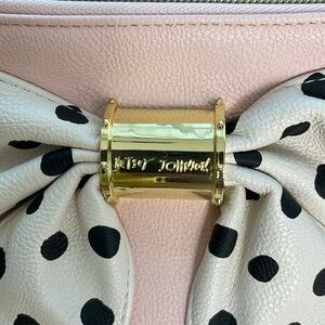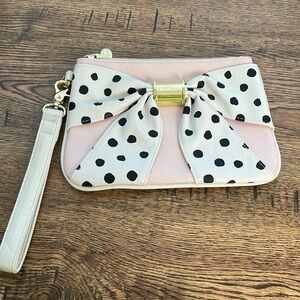 Betsy Johnson Zippered Polka Dot Bow Wristlet. In very good preowned condition. No stains or rips. Light pink with an off white bow with black polka dots. Removable wrist strap. Gold hardware with Betsy Johnson name. There are a couple scratches on the bottom of the gold. Inside is just one pocket. 8.5 inches X 6 inches. Comes from a smoke free home.