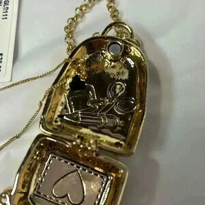 Newer tags back to cool back to school Betsy Johnson gold backpack with white rhinestones black bow opens up has magnetic closure has small pencil and ruler on chain inside backpack