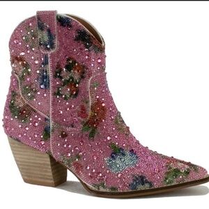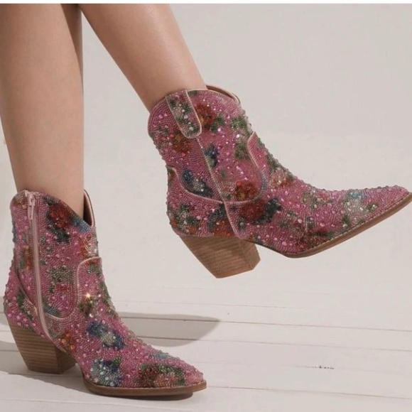 Pink Floral Womens Rhinestone Chunky Ankle Booties