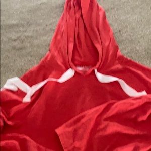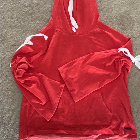 Cute bell sleeve Betsy Johnson hoodie. Light weight sweatshirt with ties on arms for cinching. White thick ties. Front pocket. Faded red color throughout. Brand new never worn.