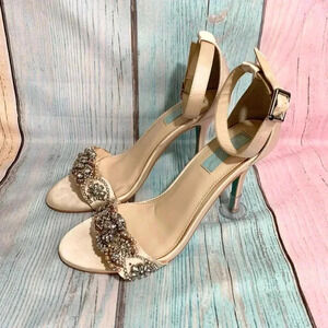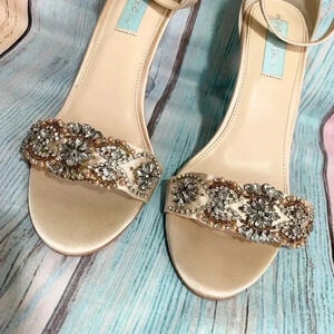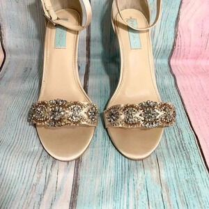 Betsy Johnson ivory beaded bridal high heels. Size 8. In great pre owned condition. Beautiful ivory satin color with beading on the front strap. Has heel protectors.