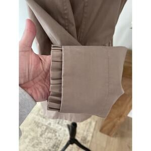 Pretty Betsey Johnson jacket! Nice and lightweight, like a spring type windbreaker, although heavier than a ‘thin’ windbreaker. Ruffle on the back and sleeves. Zippers functioning! Smoke free home. Pretty beige/taupe color with gold hardware. Detachable hood.