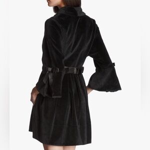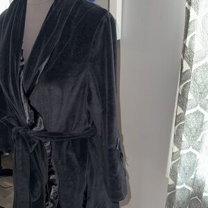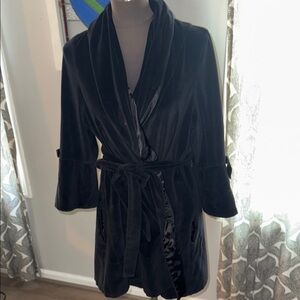 Super soft! This robe is in excellent condition & is adorned with satin bows. Size medium. Measures 34” long & has 20” long sleeves. Cotton/ polyester blend.