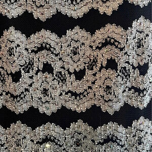 Gorgeous bodycon style dress that could be worn strapless as well. Tag states size 10, but please see measurements as well. Black with silver lace and interspersed sequins.