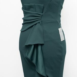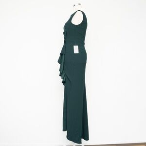 A trumpet gown in scuba crepe looks classic and refined with a ruffle artfully cascading down the slit front. Full-length trumpet skirt with front thigh-high slit Side slit with ruffles, V-neck back Invisible zip closure Bateau neck Sleeveless Lined
