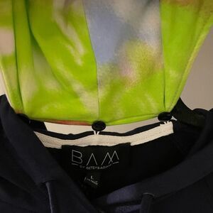 This hoodie is super comfy and has a beautiful colorful mask attached. Please see pic it is attached by buttons