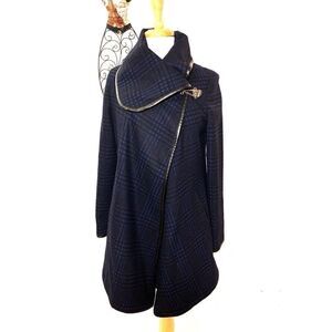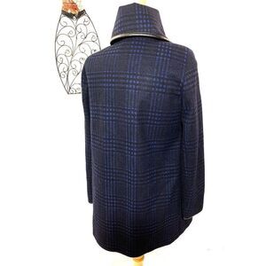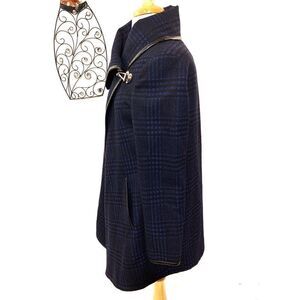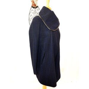 Betsy Johnson blue and black plaid cape style coat. Lightweight polyester/wool/nylon blend. Black faux leather trim throughout. Two front pockets, two button closure with silver metal twist lock accent closure. Excellent shape but for some running wear on faux leather trim that lays on underside when worn closed.
