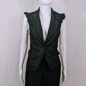 Pin stripe pattern. One button closure. Frilly sleeve edges. Stretchy material. Two faux front pockets.
