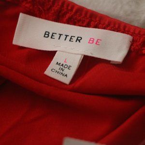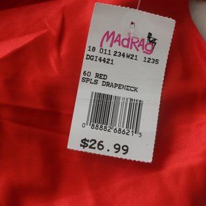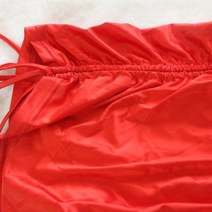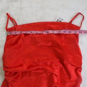 Red cowl drape neck mini dress by Better Be with scrunches that go up each side.