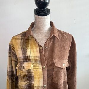 Better Be size M/L button down shirt corduroy and plaid print unique and perfect for layering over your favorite Tshirt or tank. Like new condition.