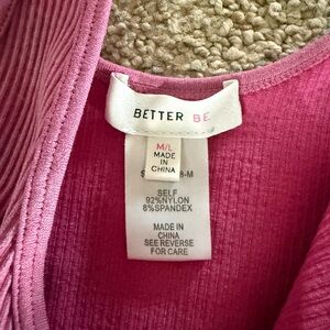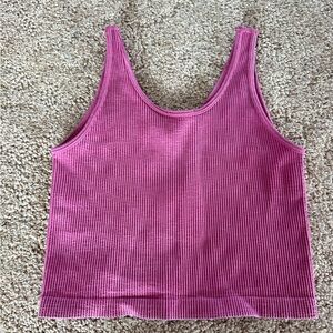 Soft ribbed knit tank with a scooped V neckline. Cropped, sleeveless silhouette for layering or warm days. Bright pink hue adds a pop to casual outfits.
