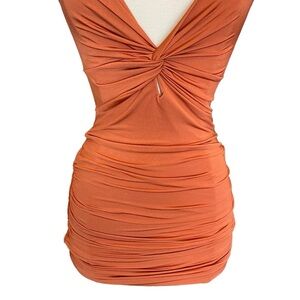 Better Be Ruched Body-con Plunge Mini Dress In Burnt Orange