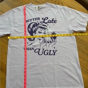 Screen print tee shirt, new with tags. Excellent condition; there are creases from being folded. Please examine the photos carefully for details about the condition. The fourth picture shows the color comparison of the shirt with a piece of white paper. Light lilac colored shirt; deep purple screen print features a vintage, comic book style cartoon image and cheeky text, “Better late than ugly.” 😂 Treat yourself to this cute tee. Perfect gift or stocking stuffer for a bride or bridesmaid.