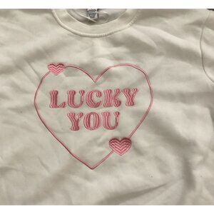 Better Together Womens Large Lucky You Heart Crewneck Sweatshirt White Pink