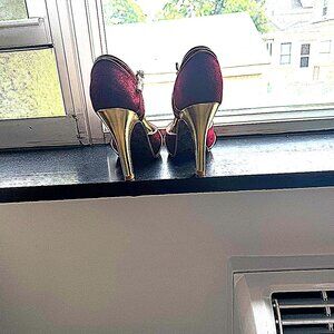 Bettie Page Velvet pumps In Burgandy And Gold. Size US 6 - pin-up style