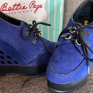 Bright blue & black, NEVER BEEN WORN, Bettie Page Shoes by Ellie. 4" heel, closed toe w/ laces. In original box. Size 6