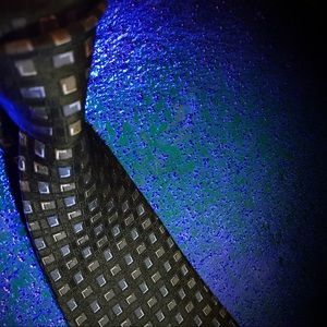 Tan & grayish-blue square on black background . Thick woven 100% silk . Fine Italian neck tie . Condition like new .