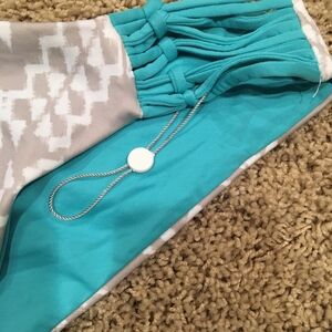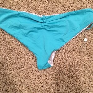 never worn bikini bottom. has a small spot from the hygiene protector as well as still have the string where the tag would still be however the paper part has come off.