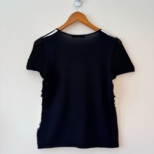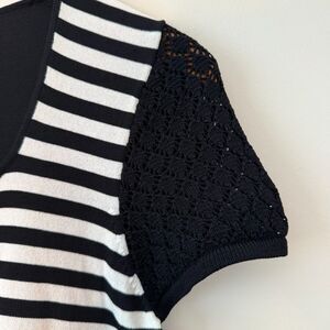 This chic Betty Barclay top combines classic black and white stripes with a playful floral pattern. The open-knit sleeves and bottom hem add a touch of modern flair, while the solid black back maintains a streamlined look. Perfect for a casual day out or a dressed-up evening.