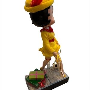 Porcelain Betty Boop figurine from 1995 standing on a pedestal. She is wearing a yellow dress, matching hat with a red feather, and yellow shoes. She is holding shopping bags labeled "Boopies". She has gold earrings. The figurine comes with a pedestal.