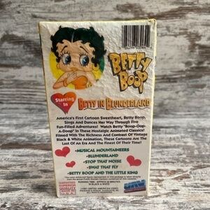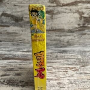 For sale is a rare Betty Boop "Shrink Five Cartoons" VHS tape, perfect for collectors and fans alike. The VHS tape itself is in pristine condition, having never been played, and remains sealed in its original packaging. The box, while it has some minor damage, is largely intact and includes the UPC code, ensuring its authenticity. Despite the slight imperfections on the box, the overall condition is very good, making it an excellent addition to any collection. This classic Betty Boop compilation captures the timeless charm of the beloved character and offers a nostalgic viewing experience for those who appreciate vintage animation.