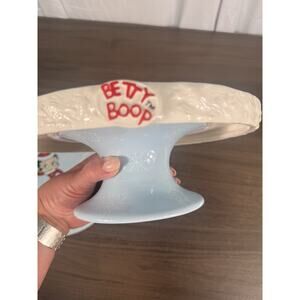 Add some vintage holiday cheer to your collection with this Betty Boop Christmas Plate featuring Betty in a festive red outfit and her adorable dog Pudgy. The light blue background and snowflake details make it a charming addition to any Christmas display or collectible shelf.