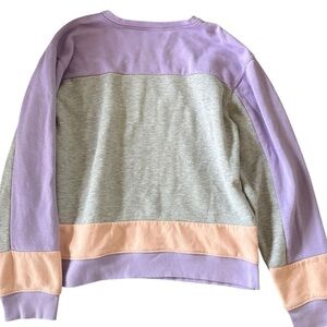Cute and cozy pullover with Betty Boop graphic on front. Colorblock panels in lavender, heather gray, and blush. Fleece-lined interior. Relaxed unisex fit.
