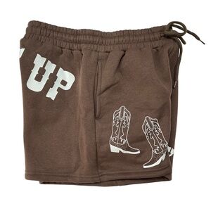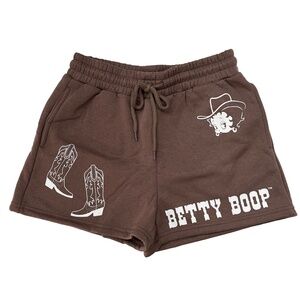 Betty Boop Giddy Up Cowgirl Fleece Shorts. Screen printed graphics on front and back. “Giddy Up” is printed on the rear. Pull on styling. On seam hand pockets. Elastic waistband with external drawcord. 60% cotton, 40% fleece with soft brushed interior. Machine wash cold with like colors. Tumble dry low.